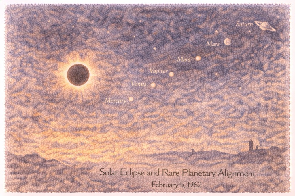 1962年2月5日は、日食とともに5つの古典的惑星(太陽系5惑星)と太陽・月が狭い範囲に配列する、稀な天文現象が起きた日でもありました。これは『グランドコンジャンクション』と呼ばれることがあり、天文観測史上しばしば話題になっています。