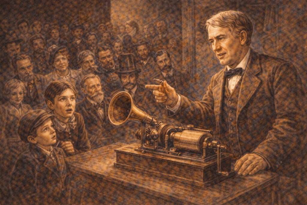 トーマス・エジソンは自ら発明した蓄音機を公の場で実演し、