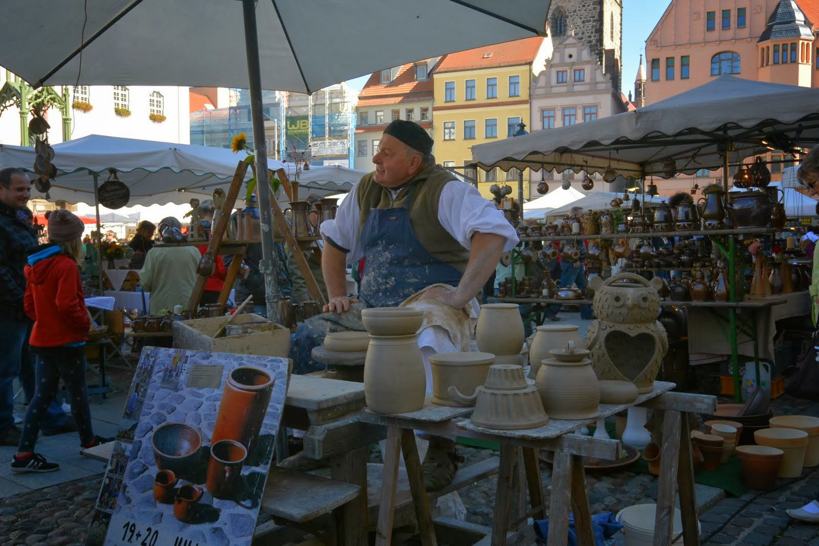 市庁舎まえの広場では、陶器祭?でしょうか。陶器市が開かれており賑わっていました。また、その近くでは秋の実りを喜ぶ催しもなされていて、地元の物産が売られていました。リンゴと大きなソーセージをはさんだホットドックを食べ、手作りのリンゴ・ワインやハニー・ワインを飲みました。活気が感じられて、嬉しいことでした。