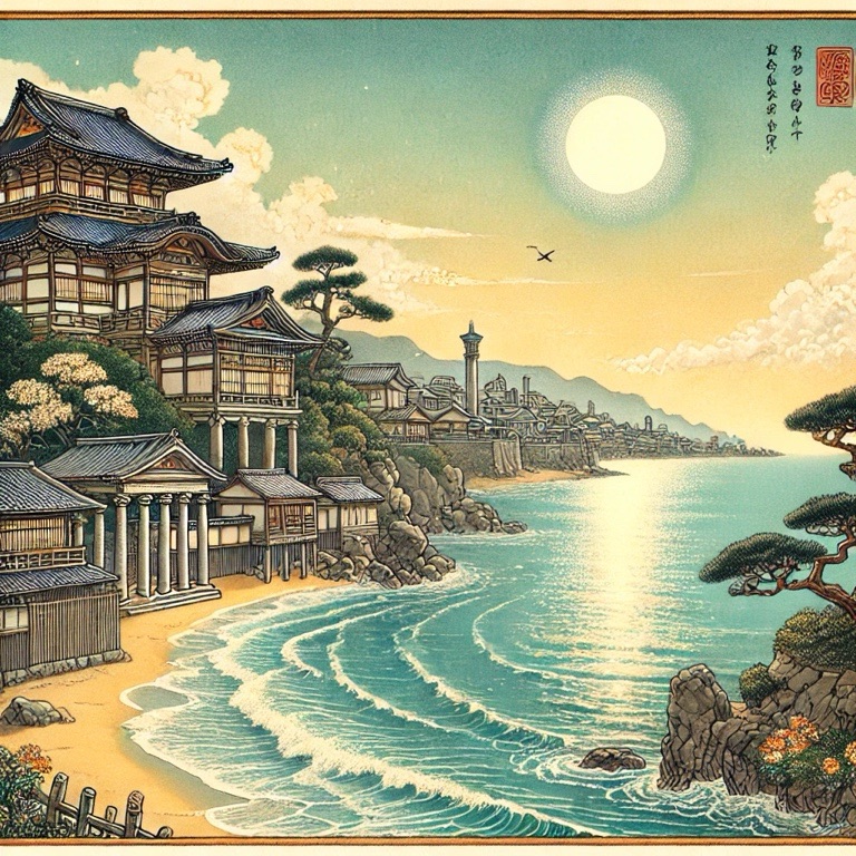 この翻訳では、原文の簡潔さと季節感を保ちつつ、ラテン語の文法構造に合わせて表現しています。「寺と町が一つになった」という意味を受動態で表現し、「夏の海」を文の最後に置くことで、原文の余韻を残そうと試みました。