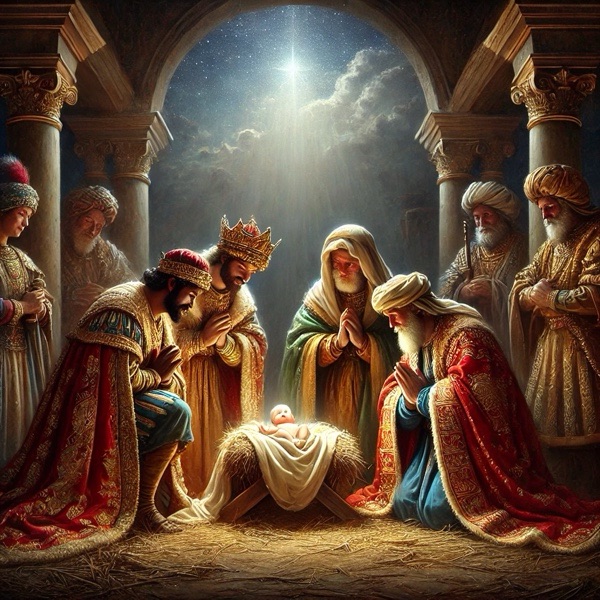 - 黄金・乳香・没薬という三つの贈り物を暗示