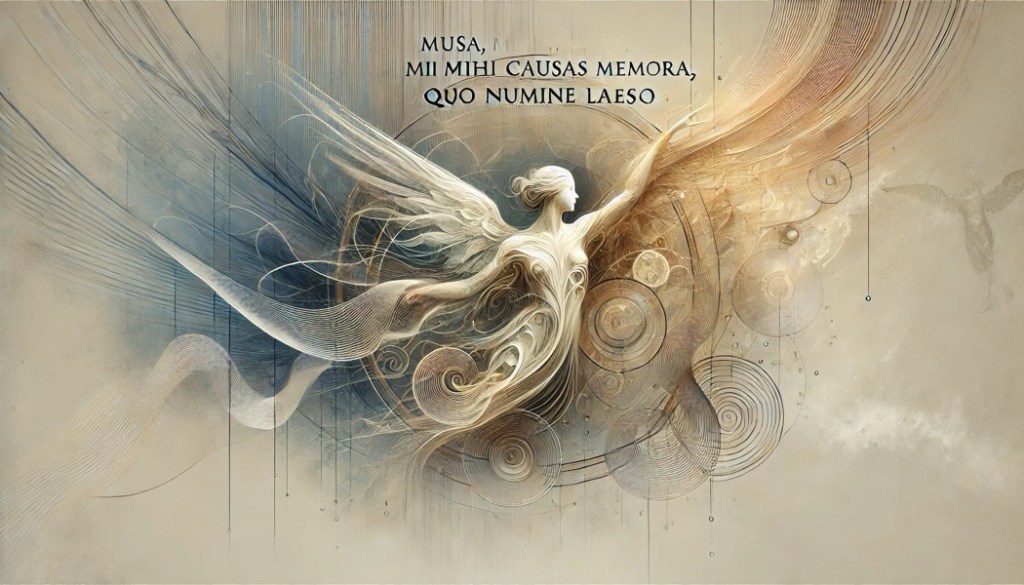 「ムーサ(詩の女神)よ、私に理由を語れ、どのような神意が傷つけられて(このようなことが起こったのか)」