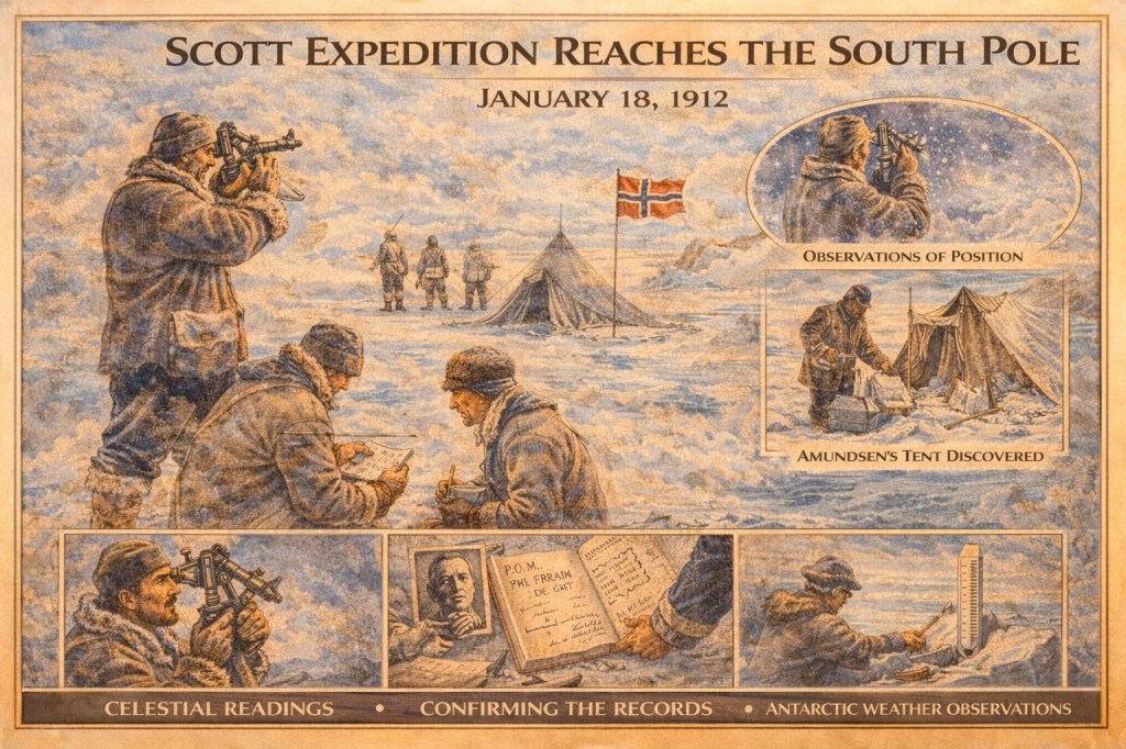 南極探検の要は“栄誉の競争”だけでなく、極限環境での位置決定(天文観測)・地理記録・気象観測です。日誌が示すのは、感覚ではなく観測値の積み上げで“いまどこにいるか”を決める科学的プロセスそのものです。 テラ・ノヴァ遠征は地理到達だけでなく、地質・生物・気象などの科学目的も持っていました(その意味で、ここは“探検=科学プロジェクト”が最も劇的に可視化された場面の一つです)。