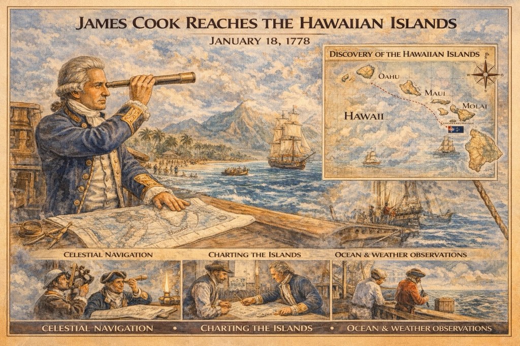 1778年1月18日、イギリスの航海者ジェームズ・クックが現在のハワイ諸島に到達(オアフ島付近を視認)したと記録されます。