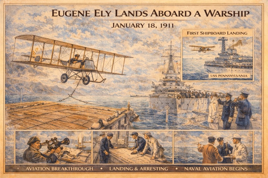 1911年1月18日、飛行家ユージン・イーリーが複葉機で、サンフランシスコ湾に停泊する装甲巡洋艦USS Pennsylvania の甲板上プラットフォームへ着艦。艦上での初の成功例として知られます。スミソニアン航空宇宙博物館や米海軍史部門の写真解説でも、この日付で整理されています。
