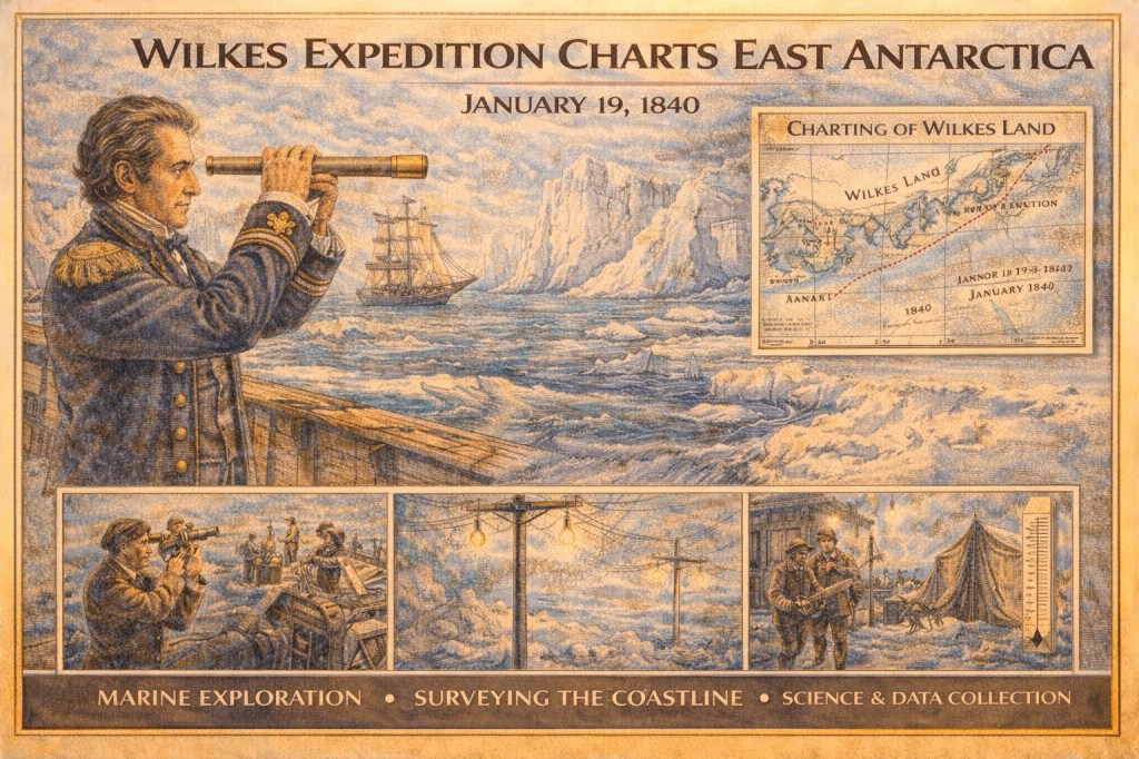 米国探検遠征(United States Exploring Expedition)の一員だったチャールズ・ウィルクスが、1月19日に東南極の沿岸部を視認し、海岸線の把握(記録・測量)を進めたとされます。後にこの一帯は「Wilkes Land」と呼ばれるようになります。