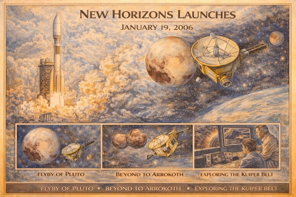 2006年1月19日、NASAの探査機New Horizonsが打ち上げられました。冥王星系のフライバイ探査(2015年)に成功し、その後さらにカイパーベルト天体アロコス(Arrokoth)へ到達する道を開いたミッションの出発点です。