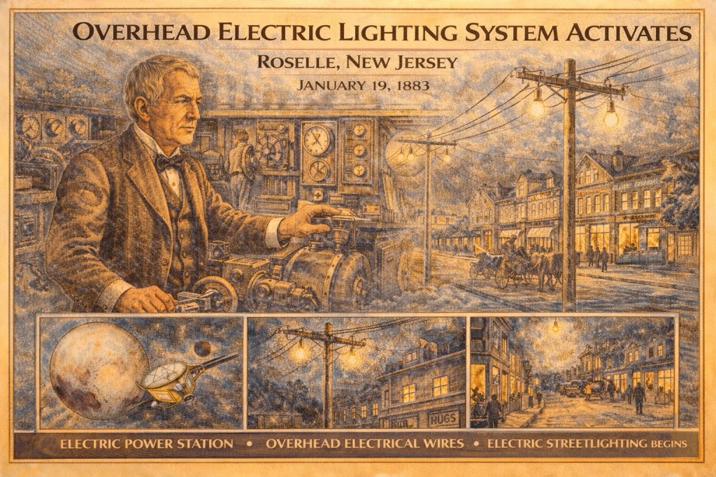 1883年1月19日、ニュージャージー州ロゼルで、架空線(電柱の上を通す配線)を使った電灯供給システムが稼働を開始した、という記録があります(トーマス・エジソンの実験として説明されます)。