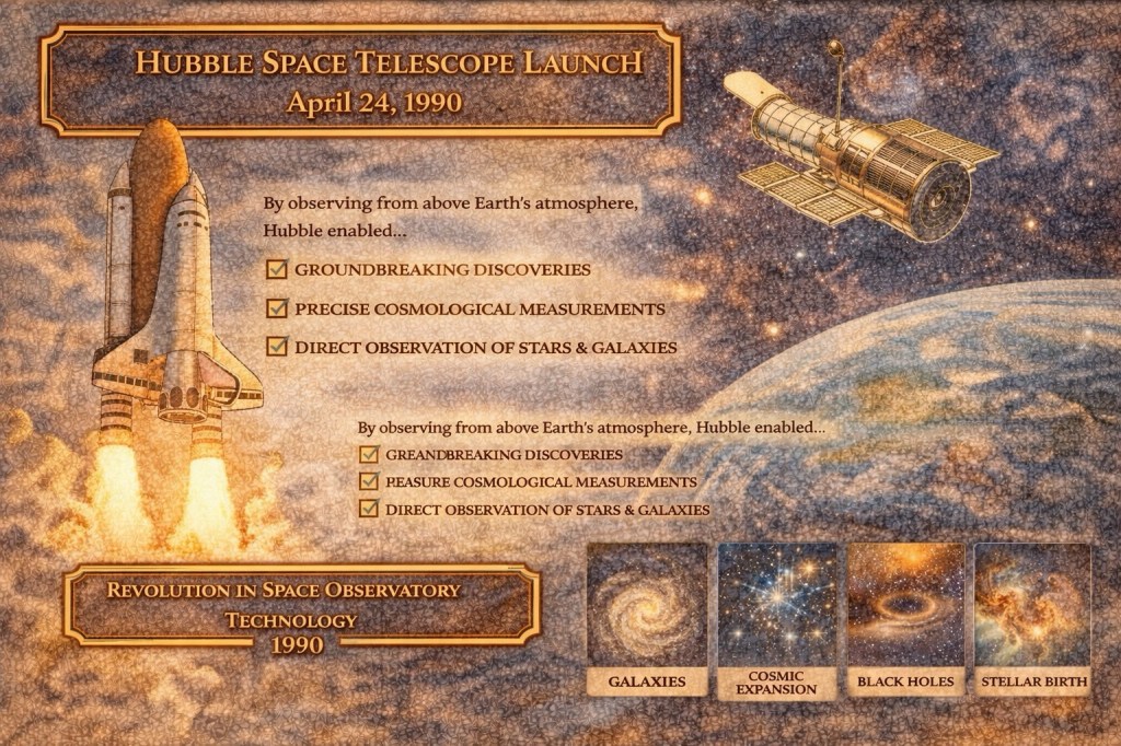 4月24日は、「観測が歴史を変え、技術がそれを支える」タイプの出来事が並ぶ日です。代表的な3件を、流れが見えるように挙げます。