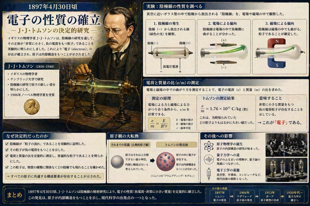 電子の性質(電荷・質量比)を定量的に示しました。