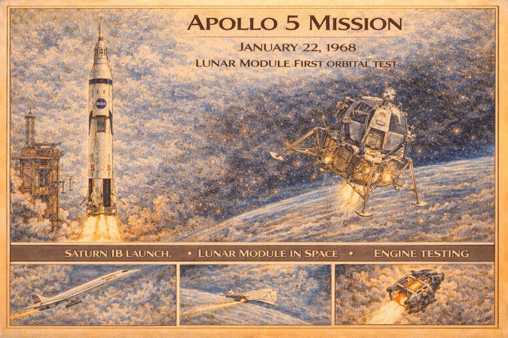 1968年1月22日、サターンIBでアポロ5号が打ち上げられ、グラマン製の月着陸船(Lunar Module)LM-1が初めて地球周回軌道で試験されました。降下段・上昇段エンジンを含む「月着陸の手順を模擬する一連の動作」を実施しています。